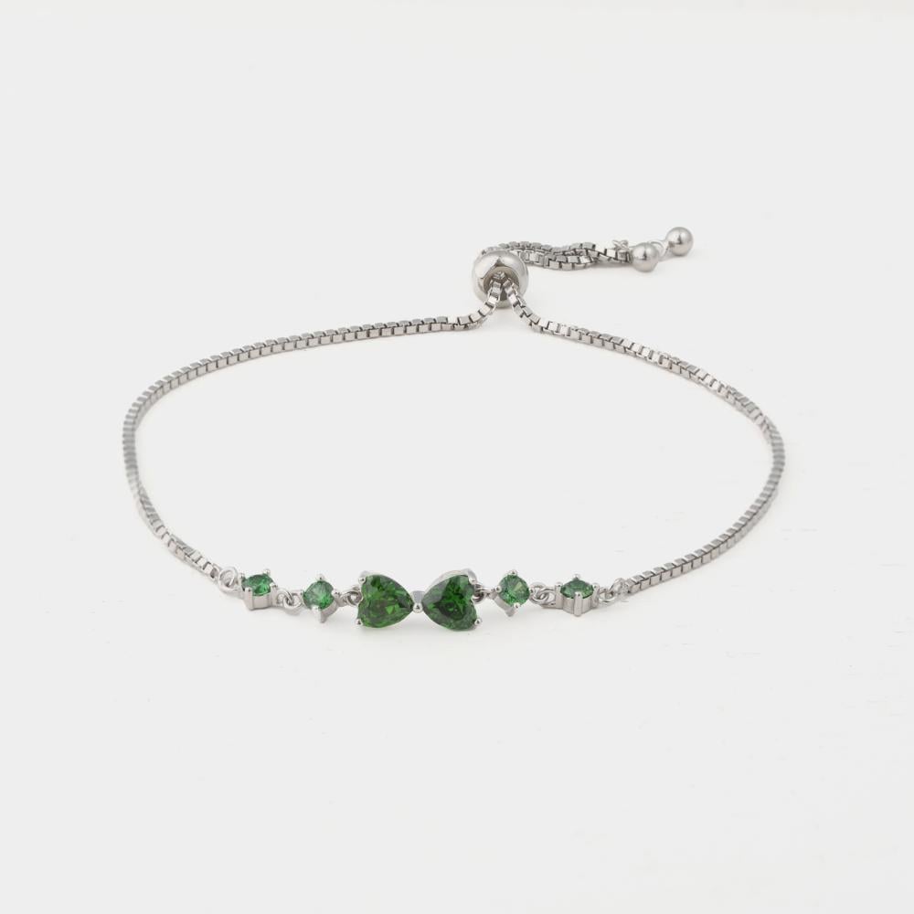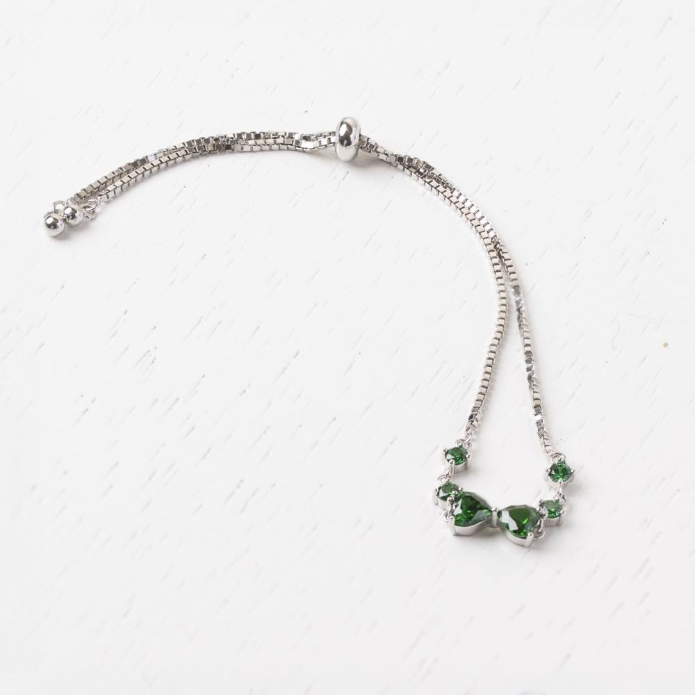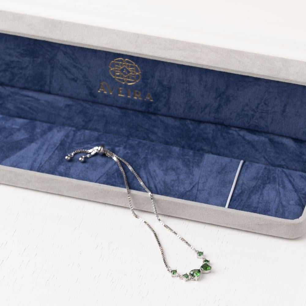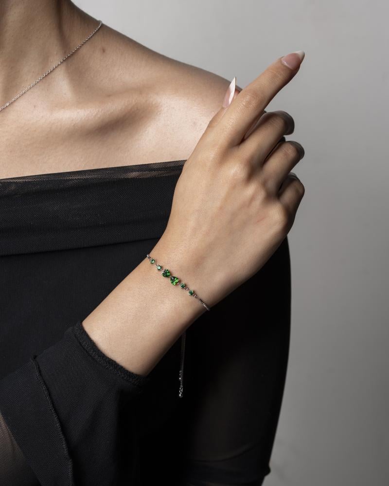 سوار "ميلا" هو قطعة مجوهرات أنيقة تميزها البساطة والفخامة في تصميم واحد. يتزين السوار بخمسة أحجار زركونية خضراء لامعة على شكل قطرات صغيرة، مما يضفي لمسة من التألق والأنوثة على التصميم. تم صنع السوار من الفضة الاسترليني عيار 925، ومطلية بالروديوم الفاخر لضمان مقاومته للخدوش والتأكسد، مما يضمن له بريقًا طويل الأمد. السوار مزود بنظام قابل للتعديل من 15 سم إلى 20 سم، مما يجعله مناسبًا لمعظم الأحجام.