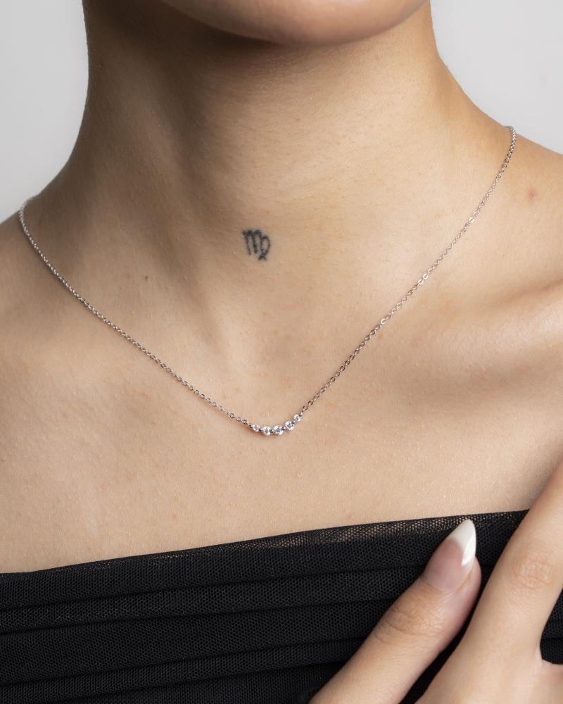 قلادة "نورا" هي قطعة مجوهرات أنيقة تجمع بين البساطة والفخامة، تعكس الضوء والضياء في تصميمها المتقن. تتزين السلسلة بعدد من الأحجار الزركونية اللامعة التي تضفي لمسة من التألق والرقي على التصميم. تم تصنيع القلادة من الفضة الاسترليني عيار 925، ومطلية بالروديوم الفاخر لضمان مقاومة الخدوش والتأكسد، مما يضمن بقاء لمعتها وجمالها لفترة طويلة. تصميمها الفريد يجعلها إضافة مثالية لإضفاء لمسة من الأناقة والجمال الطبيعي على إطلالتك.