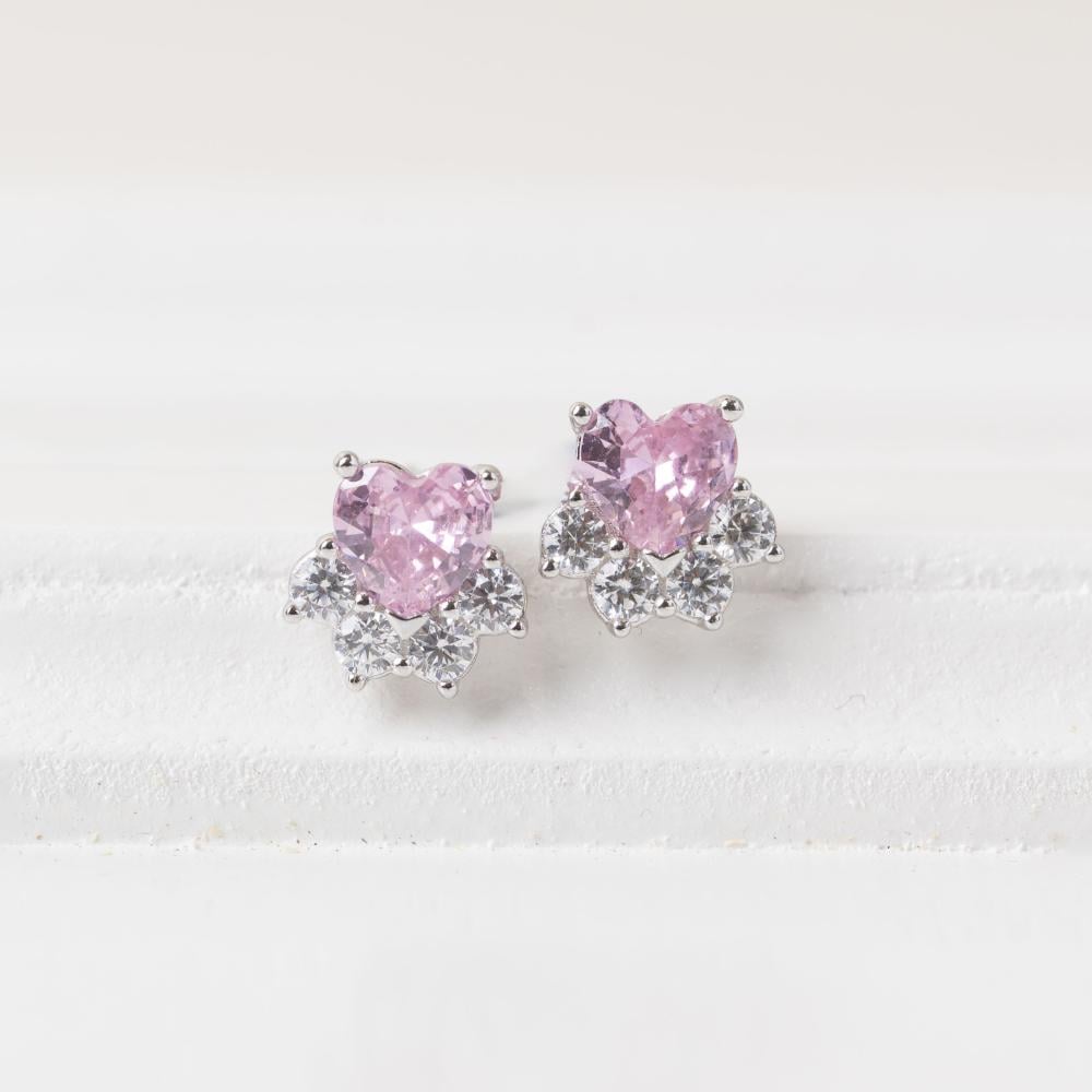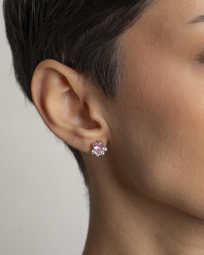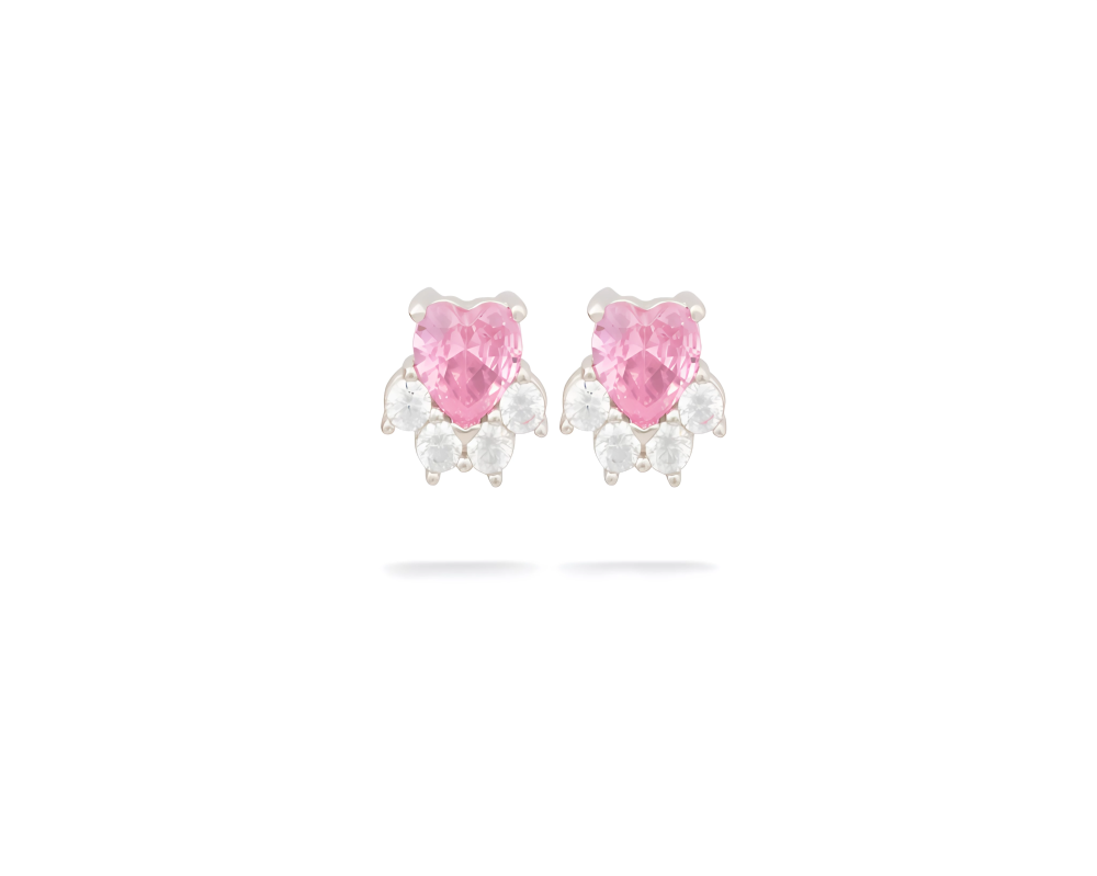 تصميم الأقراط يجسد الأنوثة الرقيقة والرومانسية الهادئة، حيث يعكس الحجر الزركوني الوردي شكل القلب المحاط بأحجار الزركون الأبيض التي تخلق تباينًا رائعًا بين الألوان. التصميم البسيط والأنيق يضفي على القطعة لمسة من الفخامة، مما يجعلها مناسبة لجميع المناسبات.