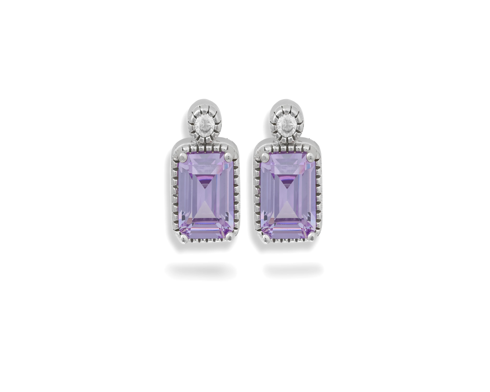 - أقراط "إلينيا": تجسد الفخامة الكلاسيكية، حيث تتوسط كل قرط حجر زركونيوم أرجواني عميق على شكل مستطيل، يكلله تصميم زهرة مرصع بالزركون الأبيض، مما يضفي ثقلاً وأناقة ملكية على الإطلالة.