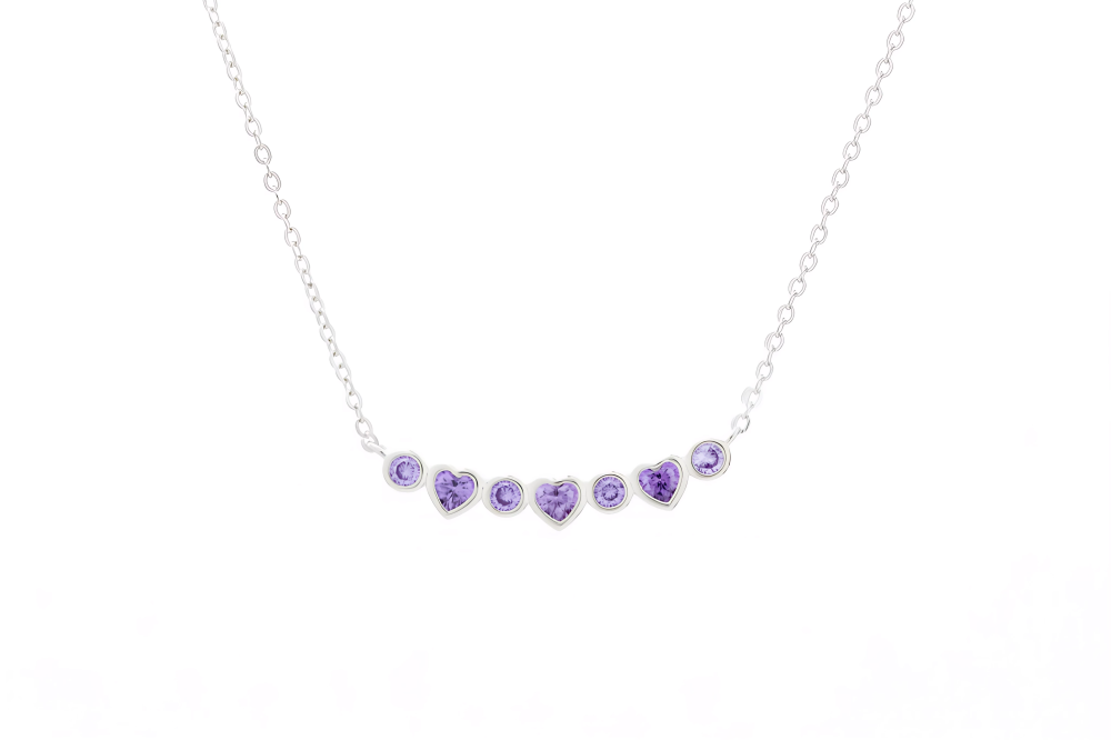 - ماذا يتضمن البكج؟قلادة "جوليانا": قطعة رومانسية ناعمة تتألق بسبع قطع زركونيوم أرجوانية على شكل قلوب متدرجة، تمنح العنق بريقاً أنثوياً آسراً.